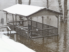 In the photo above, do you see those protrusions in the snow on the bank in the foreground? Those are our utilities on our riverbank - the lower one is the water spigot, the higher one electricity. The water pipeline was run (3') below ground level, from our house and under the road. We previously had a gazebo on a plateau just a few feet below where the spigot is situated, which was flooded in 2003. During our renovation in 2004 we dismantled the gazebo and have not rebuilt.